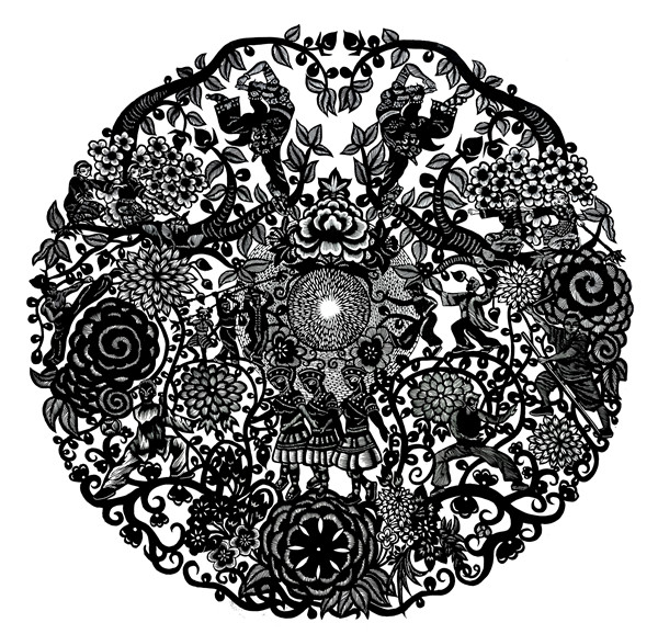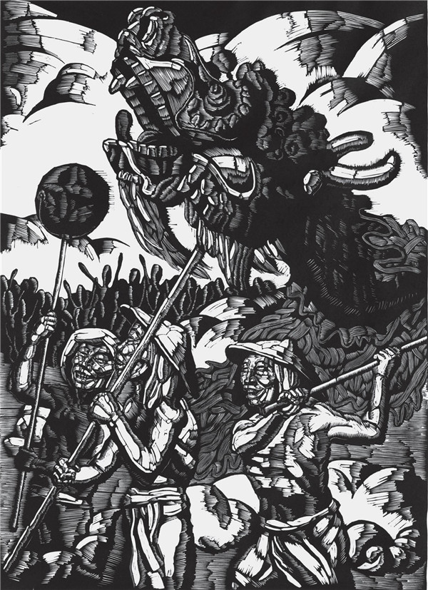 张力 黑白木刻《土家欢歌》74cmX74cm