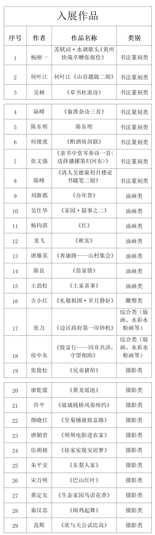 另有29件优秀作品将作为第三届四川艺术节四川文华奖美术奖优秀作品展入展作品,其中书法篆刻类8件,油画类7件,雕塑类1件,综合类2件,摄影类11件。(文综)
